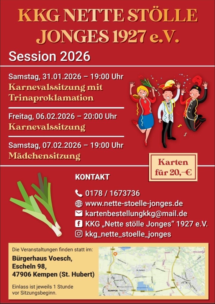 Aber auch beim Weihnachts-Bubbelmaat auf dem Hülser Rathausplatz sind wir am Sonntag, 07.12. nicht nur musikalisch ab 14:00 Uhr in Aktion, sondern auch mit einem eigenen Stand vertreten. Neben Weihnachtsschmuck können bei dieser Gelegenheit auch Eintrittskarten für unsere Karnevalssitzungen bestellt werden. Gerne beantworten wir dort auch eure Fragen zu unseren Veranstaltungen in Voesch oder zum neuen „Kultur-und Brauchtumsförderverein“ der von den vier Hülser Karnevalsvereinen gegründet wurde.